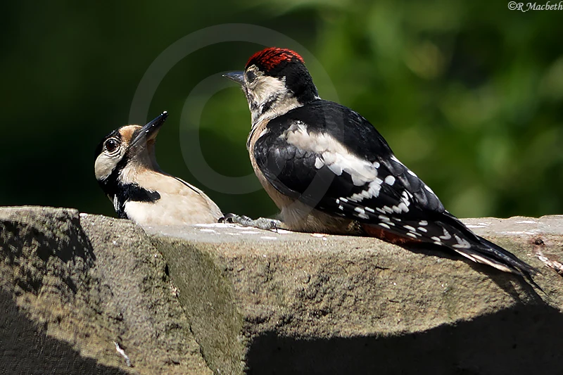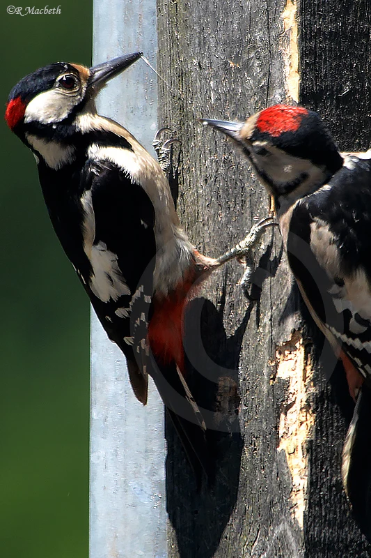 Male Great Spotted Woodpecker feeding juvenile
